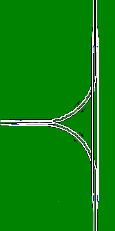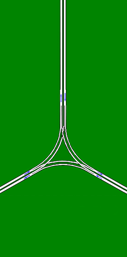 Spur Road for three directions of same importance. This is a very compact and fluent joint (without "halter" like the current trumpet-spur), but it involves some additional costs.