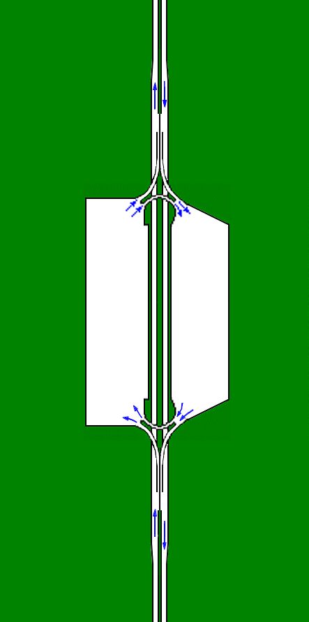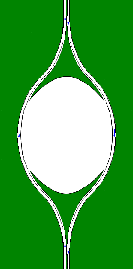 With two "halters" and six direct joints,this is a very expensive spur. But it 'looks' very safe and fluent because it needs no obstructing between the in and out coming vehicles. This last feature cannot be reached with usual four-leaved joint.