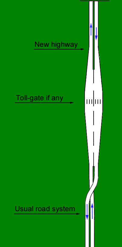 Before the toll gate or open entrance an overpass is necessary for transposing the carriageway.